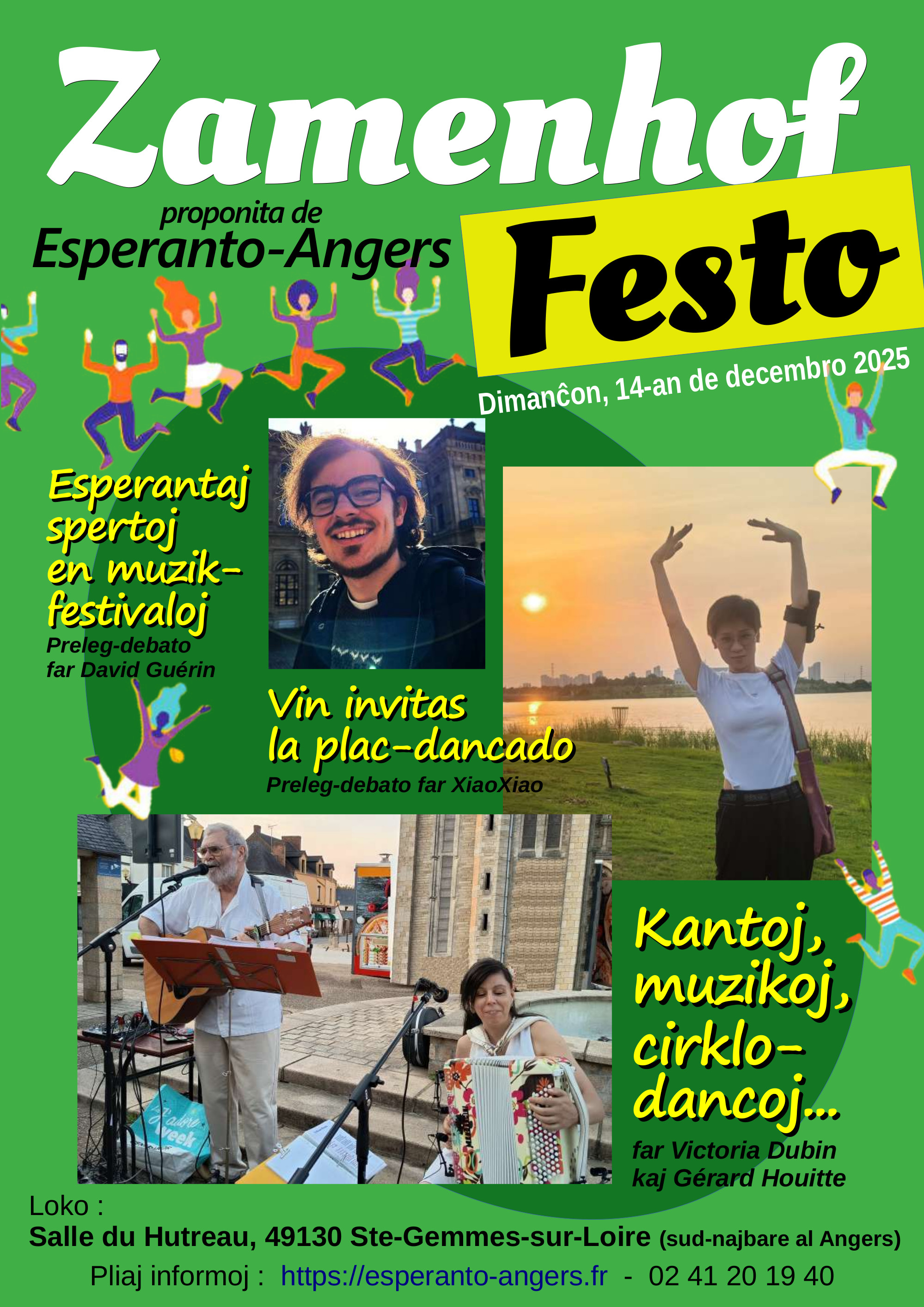 ➤ 11 décembre 18h Angers, cours de conversation ➤ 14 décembre 2025 Fête Zamenhof cette année à Angers. Attention : journée uniquement en espéranto. SAMLINGVANOJ, VIDU ĈIUJN DETALOJN DE LA PROGRAMO (journée organisée alternativement par les groupes d'Angers, du Mans et de Tours). La Fête Zamenhof, quésaco ? ➤ 15 décembre 14h-17h Permanence à la bibliothèque. Contactez-nous pour venir nous voir, emprunter...